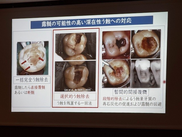 講演の前半では、深在性う蝕へのアプローチを体系的に整理したガイドラインが紹介されました。歯冠う蝕、根面う蝕、健全歯髄、失活歯髄などの状態に応じて「非切削管理」「段階的う蝕除去」「直接覆髄」「断髄」など治療判断基準がより明確になった印象です。特に注目だったのが、露髄が予測される深在性う蝕に対し、選択的う蝕除去が歯髄温存に有利であるとういう考えでした。