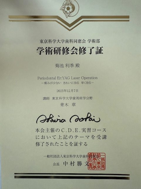 令和7年12月7日㈰ 東京科学大学にて開催された、歯周治療におけるEr:YAGレーザー操作の学術研修会を受講しました。